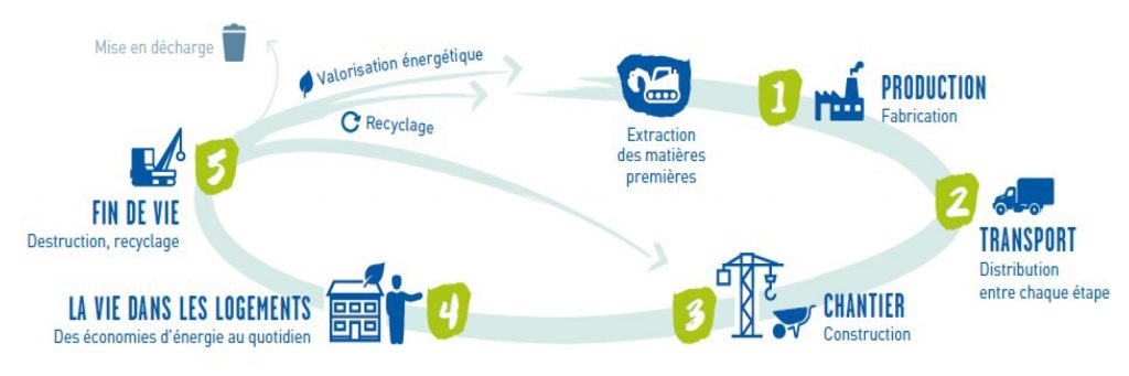 La RE2020 instaure également la mesure de la performance environnementale du bâtiment, évolution réglementaire majeure. Cette évaluation se base sur le principe de l’Analyse de Cycle de Vie (« ACV ») qui mesure l’impact environnemental du bâtiment sur l’ensemble de sa vie d’une durée de 50 ans. Voici l’illustration du cycle de vie d’un logement, de l’extraction des matières premières nécessaires à sa construction, à sa destruction et son recyclage :
